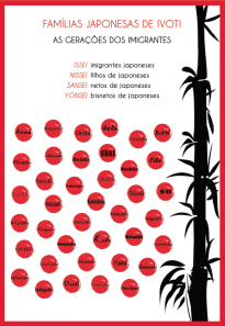 Reprodução digital de painel em fundo branco emoldurado em vermelho, com o título “FAMÍLIAS JAPONESAS DE IVOTI” em vermelho, abaixo, em letras pretas “AS GERAÇÕES DOS IMIGRANTES”. Abaixo, as nomenclaturas, começando por “ISSEI”, na cor vermelha, seguido por seu significado, “imigrantes japoneses”, na cor preta. Na linha seguinte, na cor vermelha, “NISSEI”, ao lado de “filhos de japoneses” na cor preta. Na terceira linha, na cor vermelha, “SANSEI”, ao lado de “netos de japoneses”, na cor preta. A terceira linha apresenta, na cor vermelha, “YONSEI”, ao lado de “bisnetos de japoneses” na cor preta. Abaixo, os sobrenomes de todas as famílias que residem na comunidade, em diferentes fontes, dentro de círculos vermelhos. Ao lado direito da imagem, a ilustração de um bambu na cor preta.