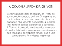 Reprodução digital do painel A Colônia Japonesa de Ivoti da exposição Cópia digital do painel A colônia japonesa de Ivoti da Exposição Kumiai - Entrelaçamentos na Colônia Japonesa de Ivoti, RS. Apresenta o título “A COLÔNIA JAPONESA DE IVOTI” na cor preta, acima do texto “As famílias japonesas chegaram, em 1966, ao recém-criado município de Ivoti. O imigrante, ao se transferir de seu país para outro, traz na bagagem não somente documentos e objetos, mas também sonhos, esperanças e saudades. A Colônia, localizada na divisa dos municípios de Ivoti e Dois Irmãos, prosperou economicamente pelo resultado do trabalho familiar, que é uma característica forte destes imigrantes.”.