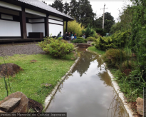 Fotografia do jardim do Memorial da Cultura Japonesa de Ivoti, tirada por um dos alunos curadores. A imagem retrata um jardim japonês, com uma casa branca em arquitetura de influência japonesa e um grupo de pessoas ao fundo. Legendada como “Jardins do Memorial da Colônia Japonesa”.