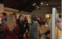 No primeiro plano `a esquerda da fotografia estão os discentes em primeiro pano. Em segundo plano é possível ver um dos moveis expositores com aquário de vidro, o qual protege os objetos museais que estão expostos em seu interior. Mais ao fundo, entre visitantes, discentes e docentes estão mais plotagens expostas, além de objetos museais.