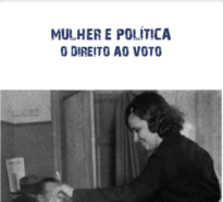 Imagem com dimensão de 80 cm X 2,00 m, em cima no centro, centralizada na imagem, há a frase: "MULHER E POLÍTICA O DIREITO AO VOTO", em caixa alta, com letras falhadas nas cor azul marinho. Logo abaixo da frase, uma foto em preto e branco de uma mulher de lado, vestindo roupas escuras e cabelo curto, colocando o seu voto em papel em uma urna. Sobrepondo a foto, há o texto: "Em 1893, na Nova Zelândia, pela primeira vez na história, as mulheres têm direito ao voto. No Brasil, esse direito foi garantido em 1932, apenas às mulheres casadas, viúvas e solteiras que tivessem renda própria. Em 1934, essas restrições foram eliminadas.". Logo abaixo do texto, em uma fonte de tamanho bem menor, o link onde pode se encontrar a informação dita no texto.