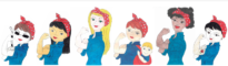 Imagem em tira horizontal de fundo branco, com desenhos de seis mulheres com diferentes características e etnias. O desenho foi feito da cintura para cima, as mulheres estão viradas para o lado esquerdo e todas estão vestindo uma camisa jeans azul e um lenço vermelho com bolinhas brancas na cabeça, fazendo a mesma pose Rosie The Riveter (Rosie a Rebitadeira) no cartaz "We Can Do It!"