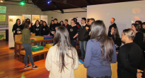 No primeiro plano é possível perceber um grupo de alunos, organizados ao centro da fotografia até o fundo do terceiro plano desta. Todos em volta das bancadas com almofadas participando de uma mediação, feita por uma das discentes curadoras responsável pela Exposição. Atrás deste grupo de estudantes, grande maioria utilizando-se de uniforme na cor preta, esta parede com plotagem de textos. No segundo plano mais ao centro, esta a arquibancada. No terceiro plano ao fundo, encontram-se os painéis com os textos plotados para embasar a visitação da Exposição, assim como totem de 4 lados plotados. Acima ao fundo é possível identificar cartazes de cores verde e branco, com texto representativo. Mais atrás esta a grade na cor preta do mezanino do museu. A fotografia conta com a iluminação de lâmpadas dicroicas e algumas lâmpadas de cores diferentes, para destacar as cores escolhidas para os determinados núcleos.