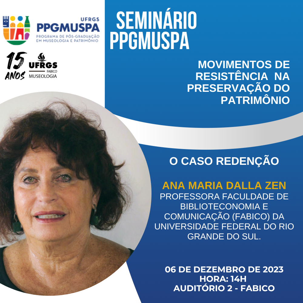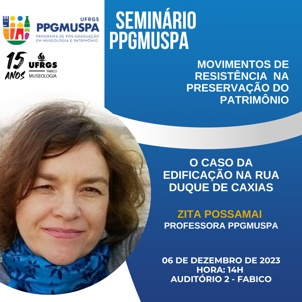 Imagem em PNG, com fundo branco e azul, contendo a logo colorida do PPGMusPa e a logo comemorativa dos 15 anos do curso de Museologia na UFRGS, com uma foto dos convidados à esquerda acima do fundo branco e o texto em cor branca acima do fundo azul à direita.