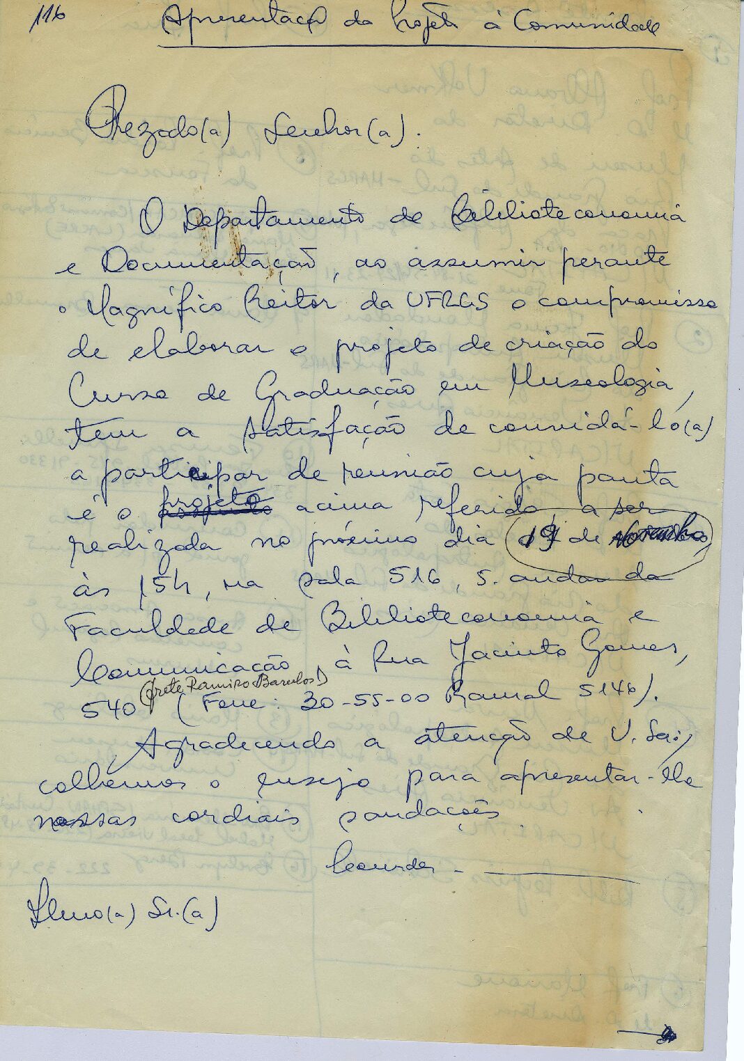 Ofício n° 166, datado em 12 de novembro de 1991, escrito pelo (a) chefe (a) do Departamento de Biblioteconomia e Documentação da Faculdade de Biblioteconomia e Comunicação da UFRGS. O documento convida o reitor a participar da reunião sobre a elaboração do projeto de criação do curso de Museologia.