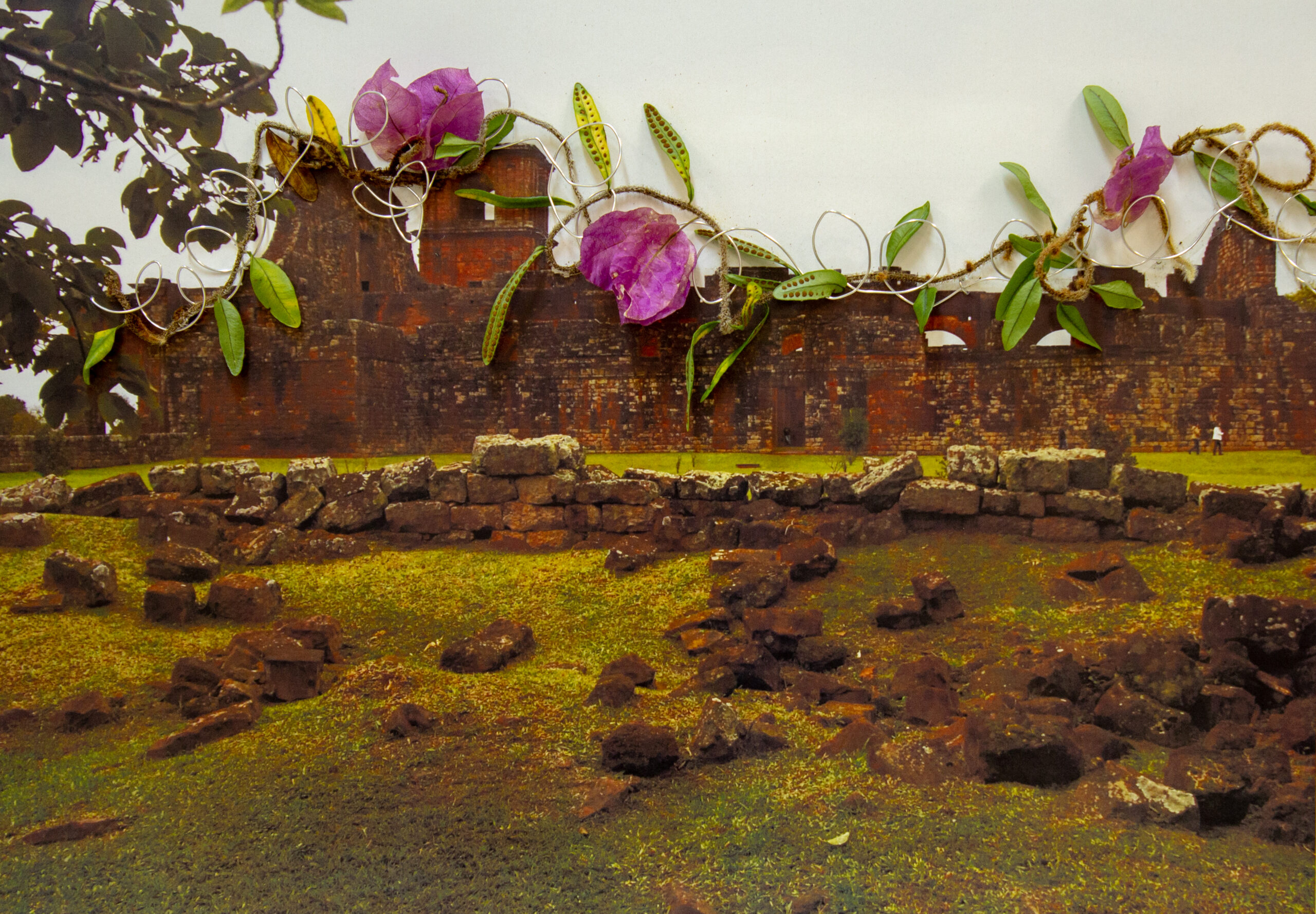 A imagem impressa em papel couchê fosco apresenta a igreja do Sítio de São Miguel Arcanjo, do ângulo da sua lateral, composta por uma série de tijolos no tom de marrom avermelhado e sujidades pretas, composta por um gramado verde claro e um céu cinza, nublado. A frente da lateral da igreja encontra-se algumas das partes da ruínas do Sítio, composta por alguns tijolos espalhados. Na parte superior da fotografia encontra-se uma intervenção à sobrepondo. A intervenção contorna toda a parte superior da igreja, como se fosse um arame farpado, feito por um fio fino de arame, misturado pelo caule de uma planta que em todo seu comprimento é composta por flores rosas e pequenas folhas verdes claro.