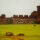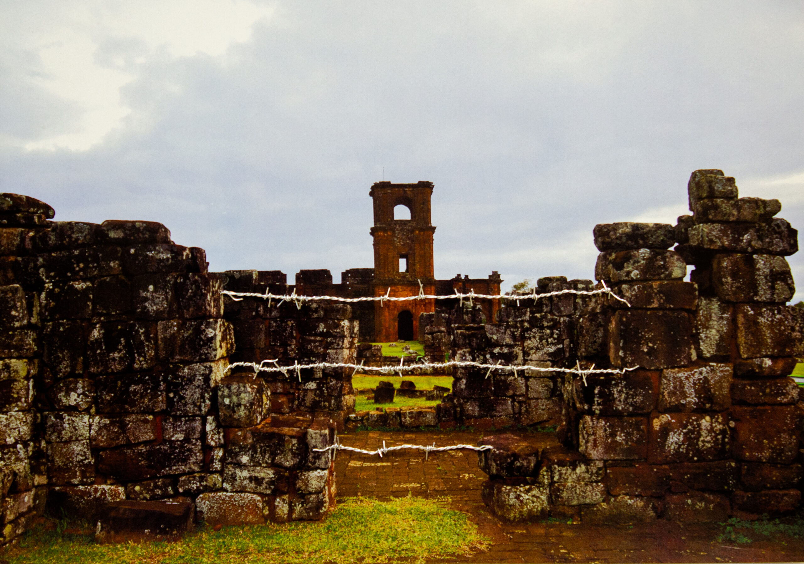 Fotografia impressa em papel couchê, em sentido horizontal, das ruínas do Sítio Arqueológico São Miguel Arcanjo. A metade superior é ocupada por um céu nublado em tons de cinza, no centro, destaca-se uma torre em ruínas em tom alaranjado. Na metade abaixo, do centro até próximo da extremidade inferior, há uma sequência de muros formados por pedras em tons de cinza e marrom, com uma passagem central até a torre, onde há uma intervenção representando três linhas horizontais de arames farpados. A extremidade inferior tem um gramado verde, que se estende na parte central até meio da imagem, onde está a torre.
