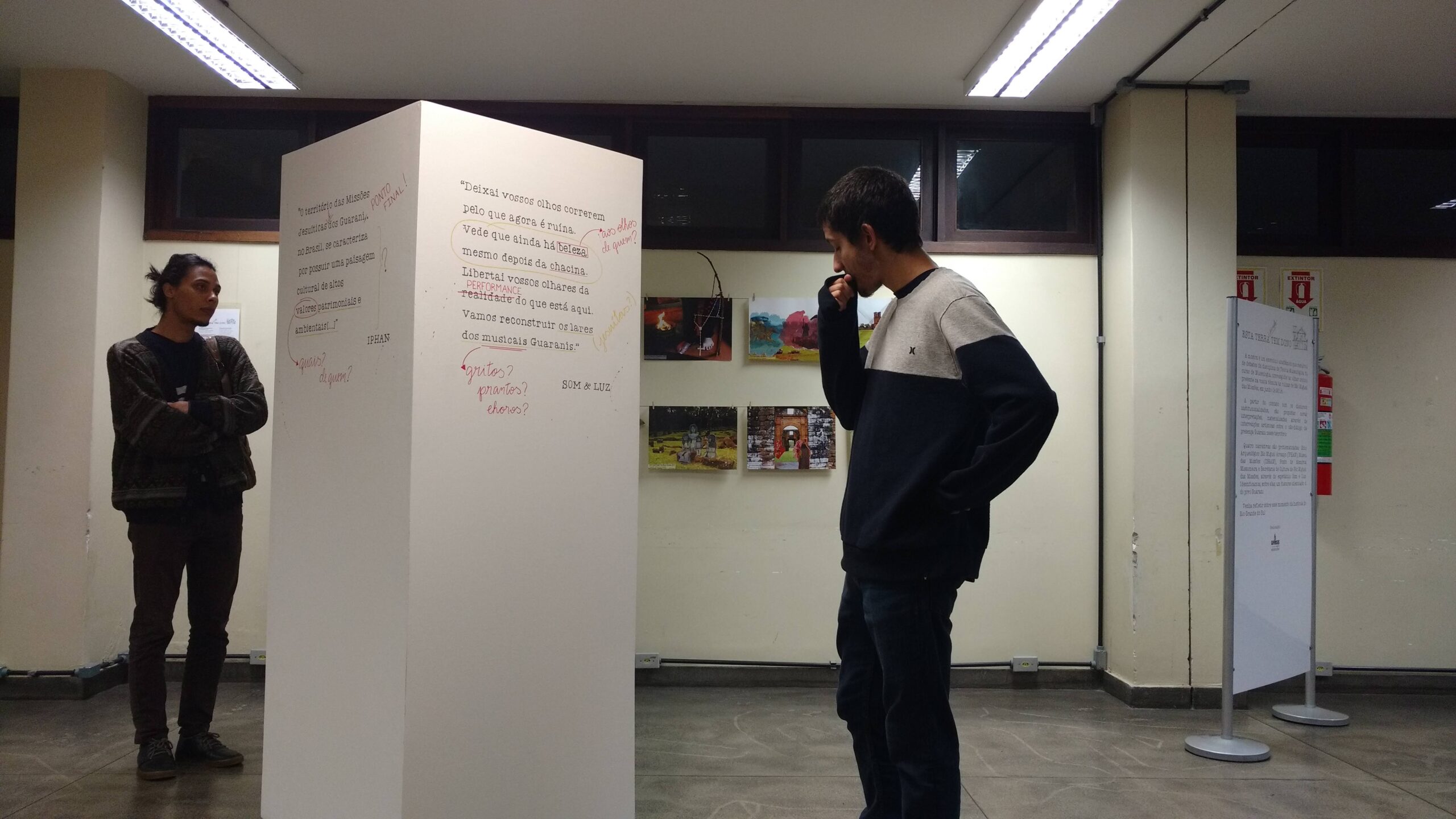 A mostra expográfica “Esta terra AINDA tem dono” é um exercício acadêmico resultado de debates da disciplina de Teoria Museológica do curso de Museologia, convergidos ao olhar crítico presente na visita técnica às ruínas de São Miguel das Missões, em junho de 2018. A partir do contato com os discursos institucionalizados, propôs novas interpretações materializadas através de intervenções artísticas sobre o não-diálogo da presença Guarani nesse território. Quatro abordagens foram problematizadas: Sítio Arqueológico São Miguel Arcanjo (IPHAN), Museu das Missões (IBRAM), Ponto de Memória Missioneira e Secretaria de Cultura de São Miguel das Missões, através do espetáculo Som e Luz. Identificou-se um discurso silenciado nesses espaços: o do povo Guarani.