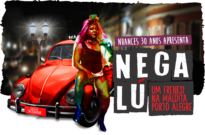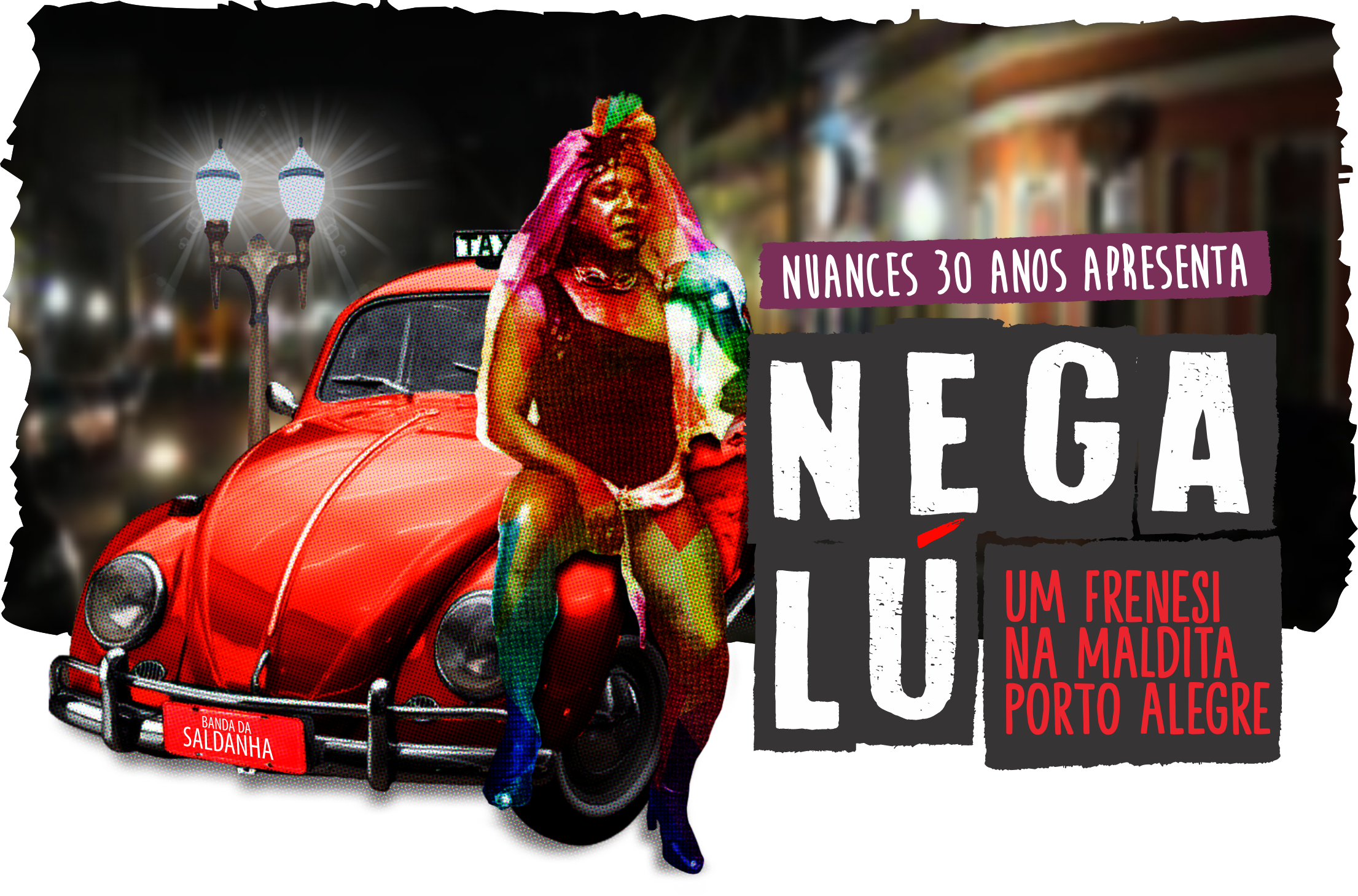 Objeto nato digital apresenta fundo predominantemente na cor preta, é um possível identificar um automóvel na cor vermelha na parte central esquerda da imagem, uma pessoa apoia-se no veículo na parte central da imagem. Ocupando quase toda metade direita da imagem apresenta-se o logo da exposição, lê-se na parte superior: "nuances 30 anos apresenta", e na inferior: "Nega Lú: um Frenesi na Maldita Porto Alegre".