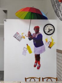 A fotografia apresenta o núcleo da Lancheria do Parque da exposição: "Nega Lú: Um frenesi na maldita Porto Alegre". Na imagem é possível identificar ao centro uma figura humana segurando um guarda-chuva colorido que projeta-se acima das plotagens, na parece branca também é possível identificar outras plotagens como cardápio, guardanapos, garrafas e copos de vidro e uma jarra.