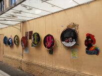 A fotografia apresenta uma parede amarela, dispostos na parede estão os sete círculos que compõem o texto expositivo do núcleo Bar Ocidente da exposição: "Nega Lú: Um frenesi na maldita Porto Alegre", além disso à direita da imagem podemos identificar uma colagem de ladrilhos que forma uma figura humana identificada como Nega Lú.
