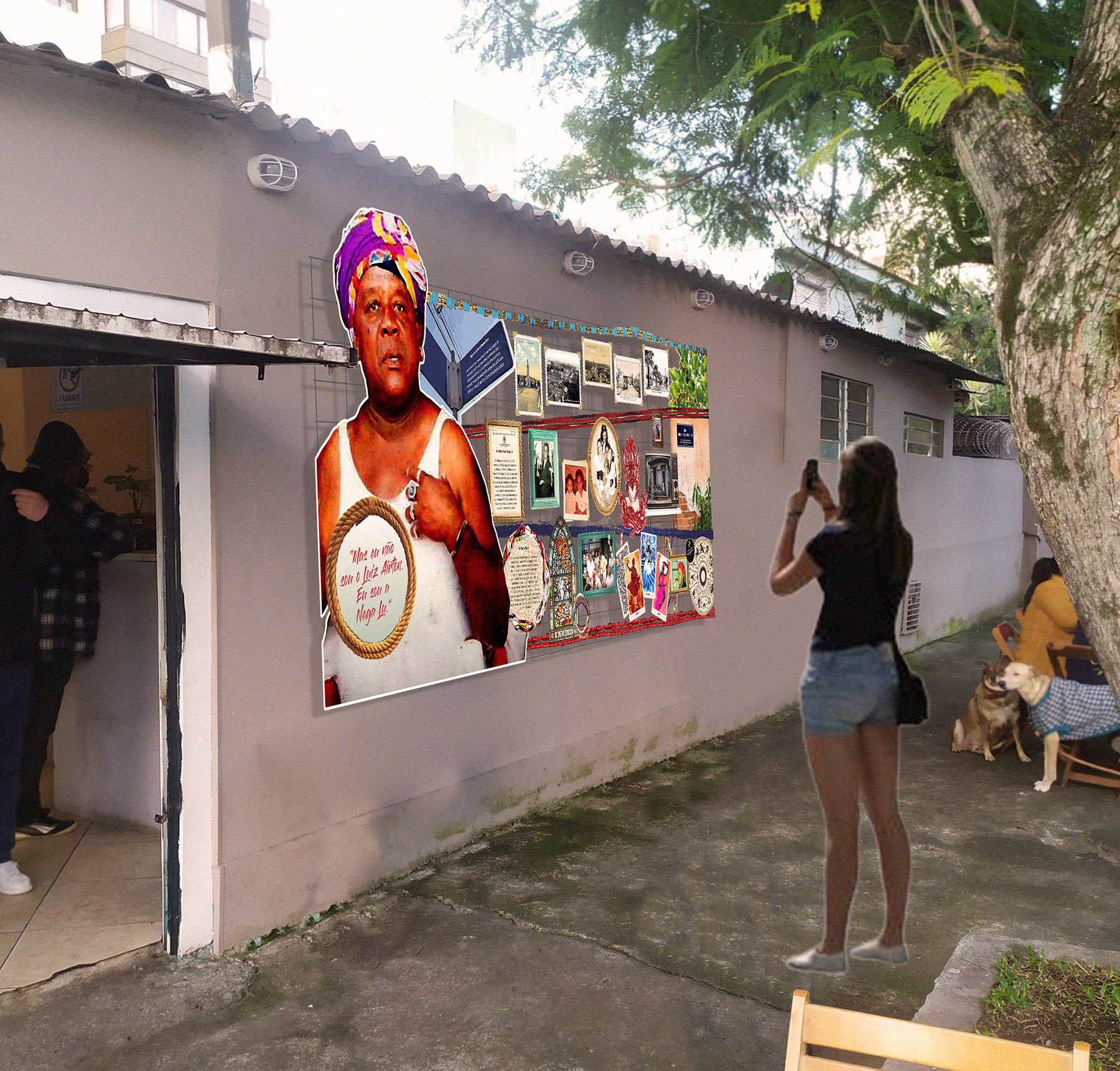O objeto nato digital apresenta uma sobreposição digital em uma foto de uma parede cinza que pode ser identificada como parte da fachada externa do Bar Plano A. Digitalmente foi inserido o mural com elementos da exposição: "Nega Lú: Um frenesi na maldita Porto Alegre".