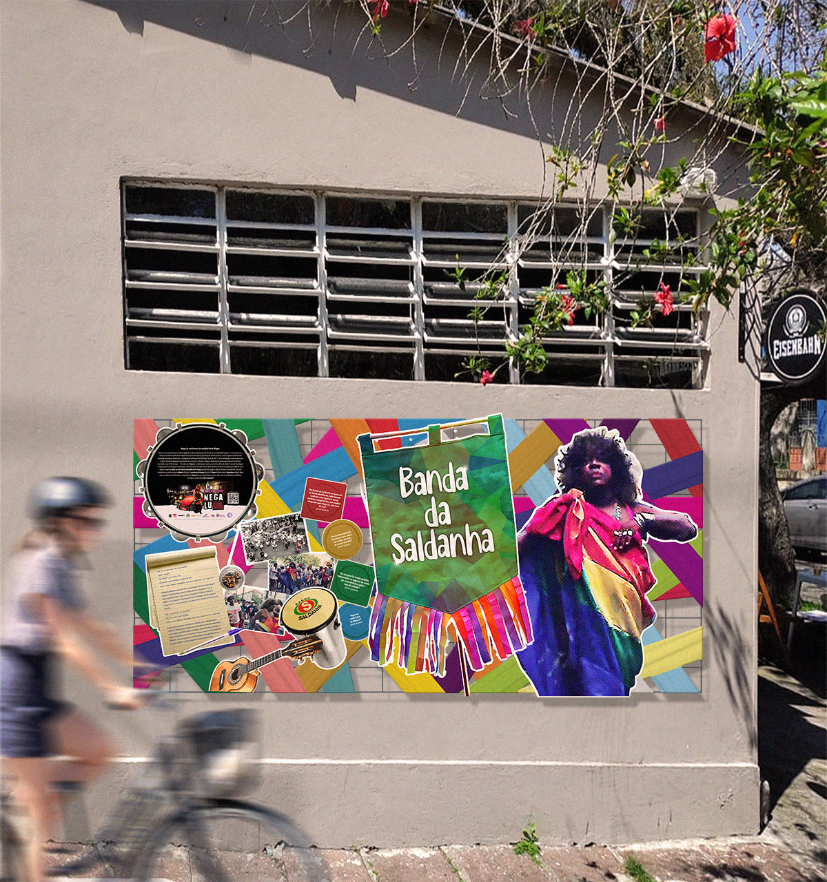 O objeto nato digital apresenta uma sobreposição digital em uma foto de uma parede cinza que pode ser identificada como parte da fachada externa do Bar Plano A. Digitalmente foi inserido o painel com elementos da exposição: "Nega Lú: Um frenesi na maldita Porto Alegre".