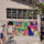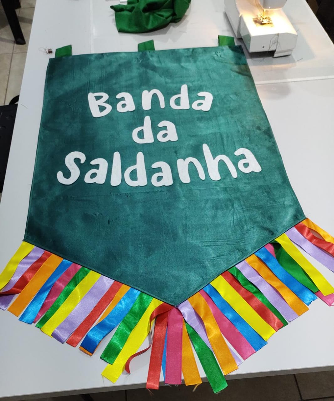Fotografia da bandeira utilizada na expografia do núcleo Bar Plano A da exposição: "Nega Lú: um frenesi na maldita Porto Alegre". A imagem apresenta uma bandeira predominantemente verde disposta sobre uma mesa, em seu centro lê-se: "Banda da Saldanha".