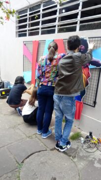A fotografia apresenta quatro pessoas de costas, duas delas à esquerda estão agachadas enquanto as outras à direita estão em pé. Ao fundo da imagem é possível identificar uma das paredes do bar Plano A, onde está sendo instalado um dos painéis da exposição: "Nega Lú: um frenesi na maldita Porto Alegre."
