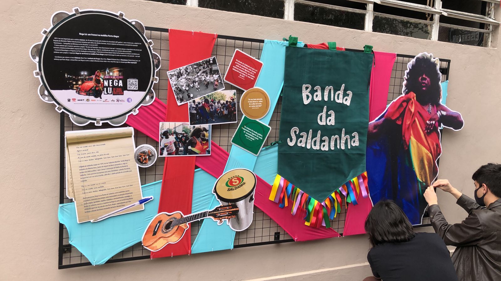 A fotografia apresenta um dos painéis utilizados na expografia do núcleo Bar Plano A da exposição: "Nega Lú: um frenesi na maldita Porto Alegre". O painel ocupa a maior parte da imagem e apresenta uma colagem de elementos relacionados ao carnaval de rua de Porto Alegre. No canto inferior direito é possível identificar duas pessoas.