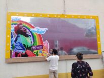 A fotografia apresenta o processo de instalação das plotagens no painel utilizado no núcleo Bar Venezianos na exposição: "Nega Lú: um frenesi na maldita Porto Alegre". Na imagem é possível identificar ao fundo uma parede predominantemente branca, duas pessoas fazem a instalação de uma plotagem que traz a figura da Nega Lú.
