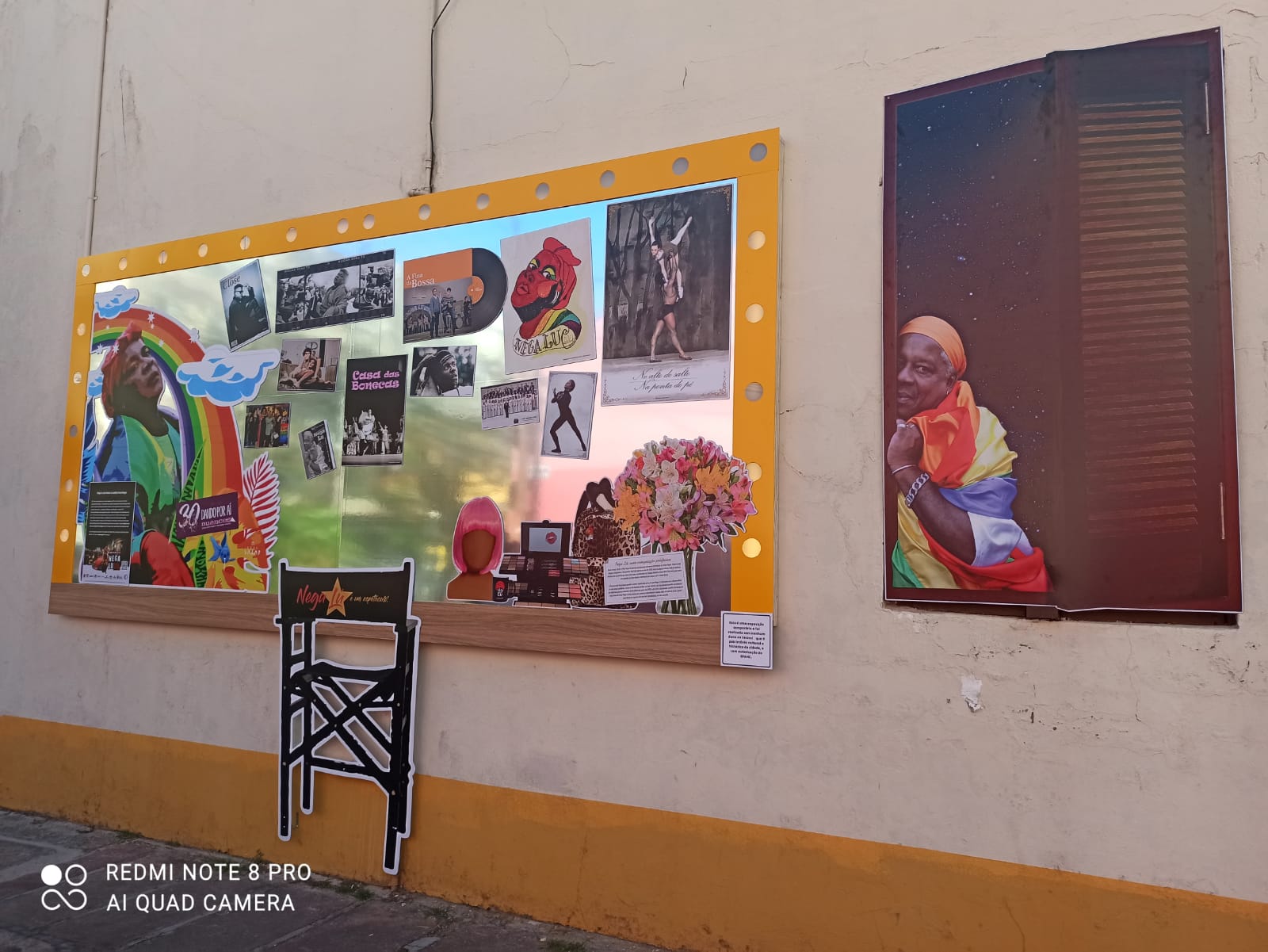 A fotografia apresenta o painel utilizado no núcleo Bar Venezianos na exposição: "Nega Lú: um frenesi na maldita Porto Alegre". Na imagem é possível identificar ao fundo uma parede predominantemente branca, o painel principal, ao centro à esquerda, apresenta plotagens que relacionam-se a parte artística da Nega Lú. Na metade direita é possível identificar uma plotagem da Nega Lú sobre uma janela.