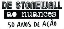 O objeto digital nato apresenta o logotipo da exposição, separado em três linhas e nas cores preto e branco. Na primeira linha lê-se: DE STONEWALL, em caixa alta, em fonte preta com bolinhas brancas no interior da margem de cada letra. Na segunda linha lê-se: ao nuances, em caixa baixa, em letras brancas dentro de um retângulo preto envolvendo toda a frase. Na terceira e última linha lê-se: 50 ANOS DE AÇÃO, em caixa alta, em fonte preta.