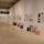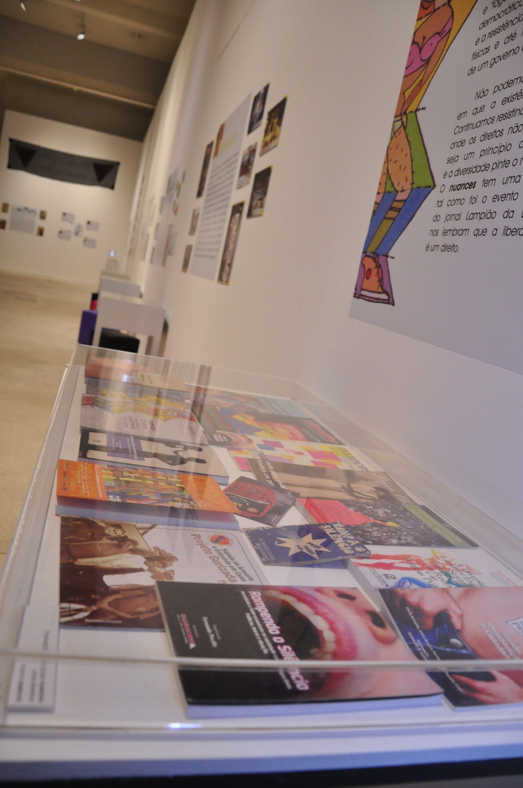 A fotografia apresenta em baixo à esquerda o topo de uma mesa expositor em primeiro plano. Alinhadas vê-se mais três mesas expositor em segundo e terceiro plano. Em cima de cada mesa há um texto expositivo. A mesa está coberta com um acrílico transparente e dentro há diversos objetos como livros e folders.