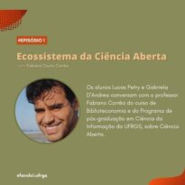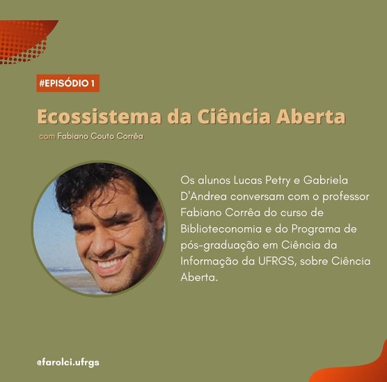 Card em formato JPG, possuí fundo verde oliva com detalhes em laranja. Possuí uma etiqueta retangular em laranja com o texto "Episódio 1" em branco no canto superior esquerdo e, no centro, o titulo "Ecossistema da Ciência Aberta" em bege com o nome do convidado em uma fonte menor logo abaixo. Abaixo do título, no centro à esquerda possui uma foto em formato circular do convidado Fabiano Corrêa, à direita, está o texto "Os aluno Lucas Petry e Gabriela D'Andrea conversam com o professor Fabiano Corrêa do curso de Biblioteconomia e do Programa de Pós-Graduação em Ciências da Informação da UFRGS, sobre Ciência Aberta". No canto inferior esquerdo está o texto "@farolci.ufrgs" em cor branca.