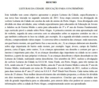 Resumo para a Feira de Ensino e Popularização da Ciência, no ano de 2012, apresentando o projeto Leituras da Cidade, projeto de Educação Patrimonial com vistas à formação de graduandos dos cursos de História, Museologia e Pedagogia da UFRGS e educadores da rede de ensino de Porto Alegre.